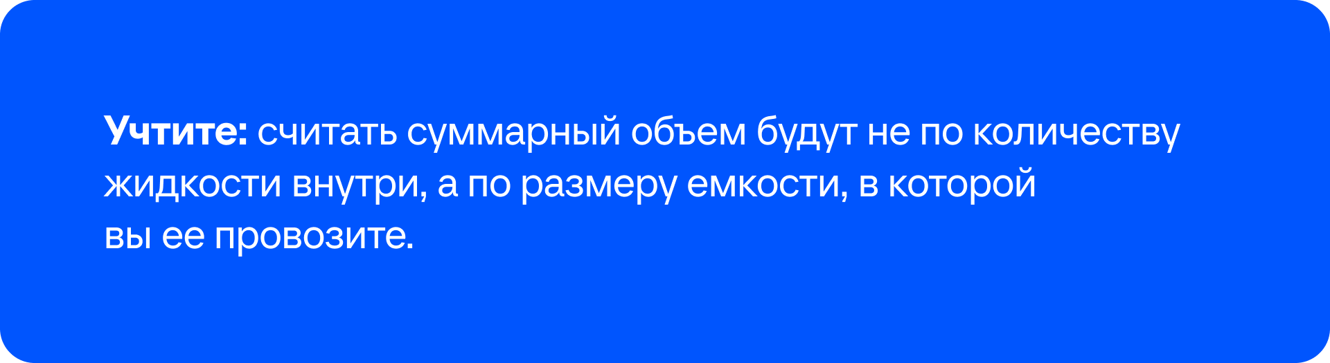 При этом лимиты на объемы жидкости, разрешенной для провоза в ручной клади, не распространяются на содержимое пакета. Однако нужно помнить: в каждой стране действуют еще и таможенные ограничения. Например, в Россию можно ввозить до 3 л алкоголя. Если провозите от 3 до 5 л, нужно декларировать покупку и оплачивать пошлину 10 € за каждый литр сверх нормы.