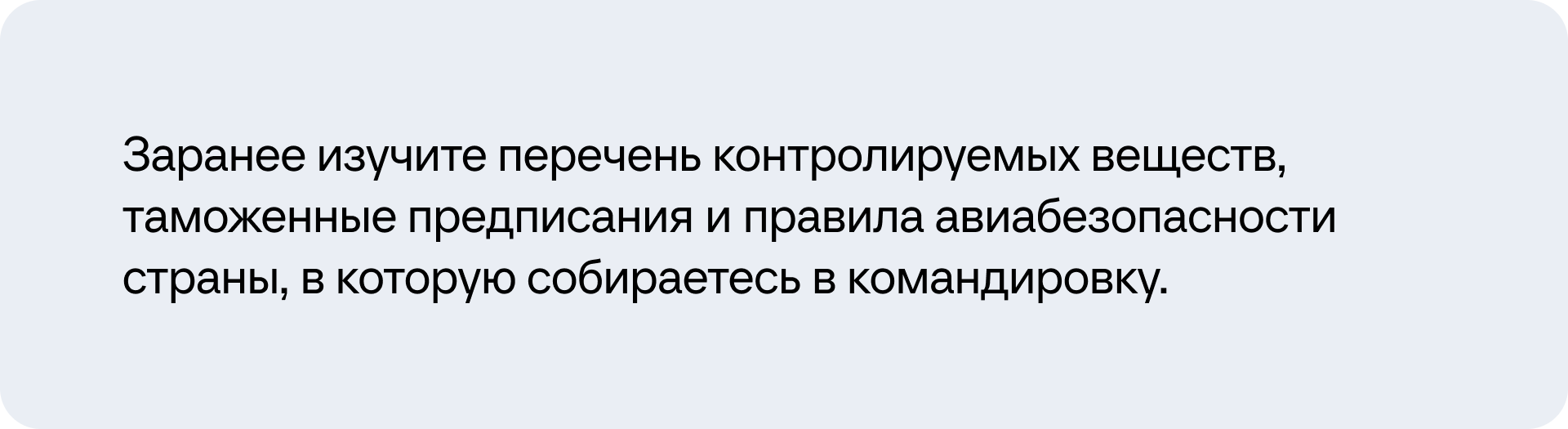 Важно: все медикаменты в жидкой форме нужно упаковать в отдельный прозрачный зип-пакет и по запросу предъявить службе безопасности аэропорта отдельно от остальных вещей.