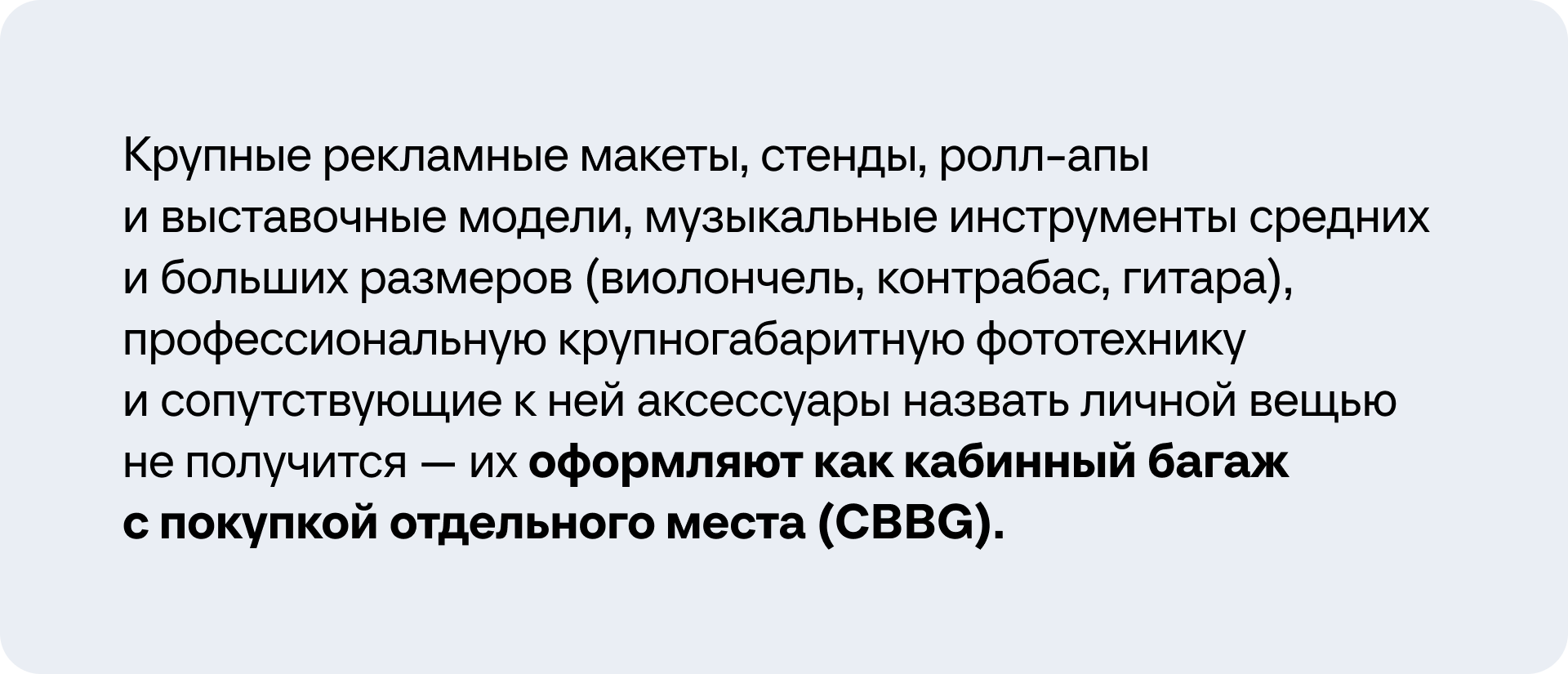 Обязательно учитывайте габариты предмета: он должен помещаться в кресло самолета, не перекрывать табло «Пристегнуть ремни/Выход» и надежно крепиться ремнями.