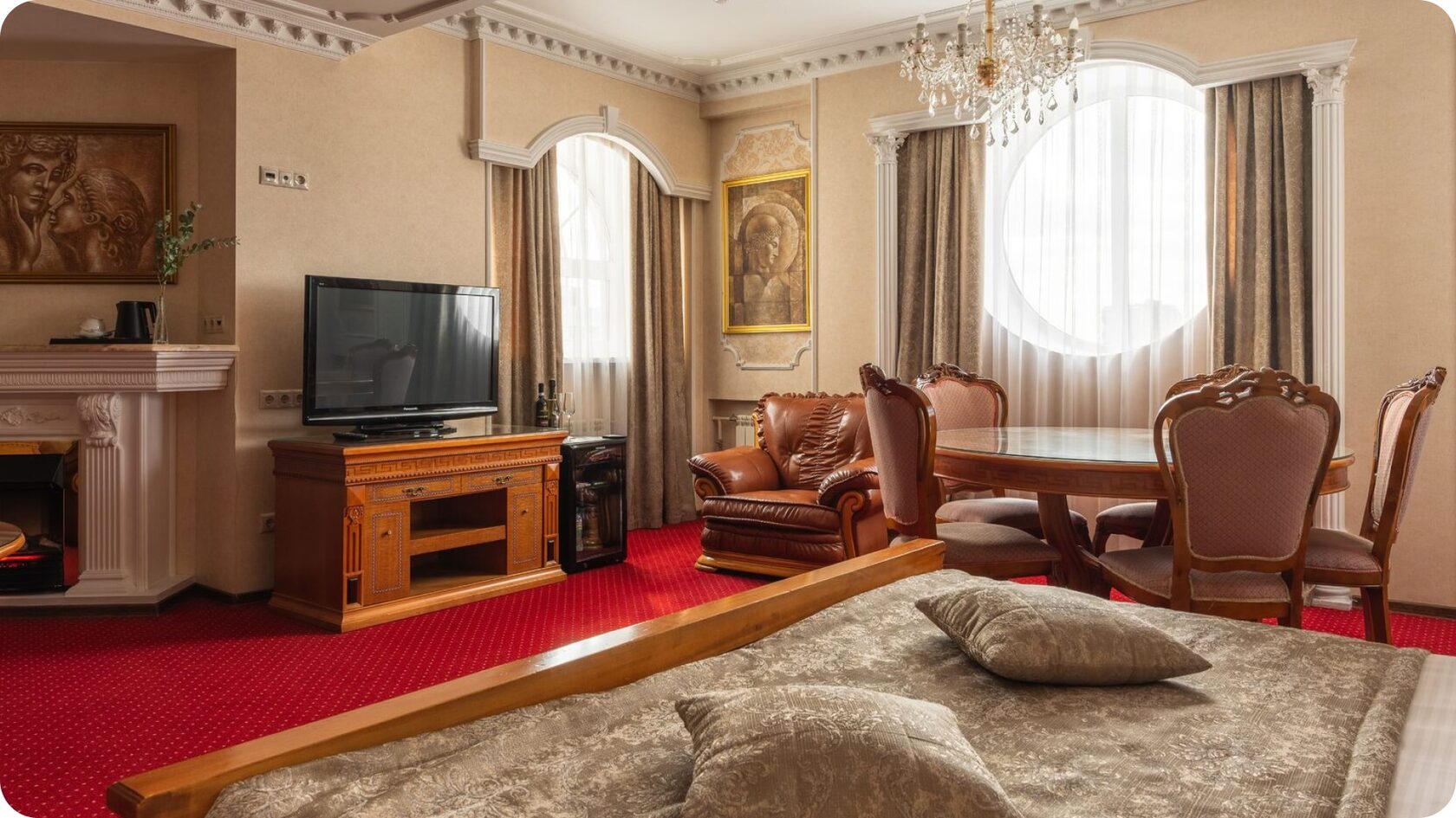 Для деловых туристов доступны 2 больших зала для мероприятий вместимостью до 80 и 300 человек, частная обеденная зона «Малахит» в ресторане отеля на 20 мест и еще несколько бизнес-пространств для камерных переговоров и встреч. Есть возможность заказать фуршет, кофе-брейк и банкет.
