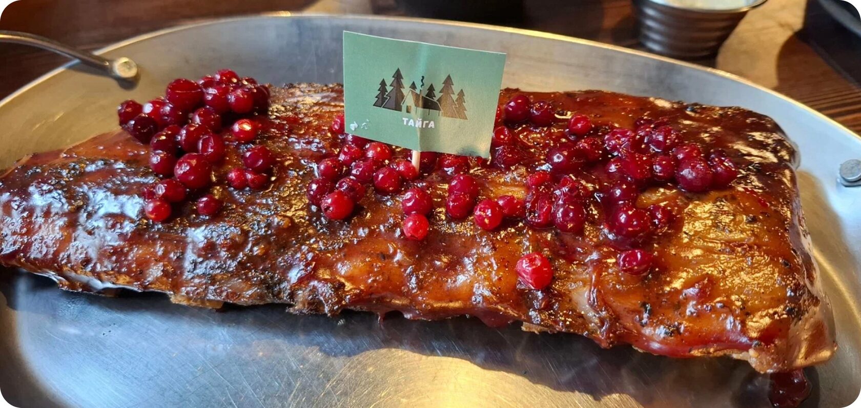 В меню есть как классика региона, так и необычные рецепты северных народов кундумы и чушь. Советуют попробовать каре косули, карпаччо из изюбря, блины с олениной и хвойное мороженое на десерт. По вечерам со среды по субботу здесь играет живая музыка, а по будням с 12:00 до 16:00 подают бизнес-ланчи.