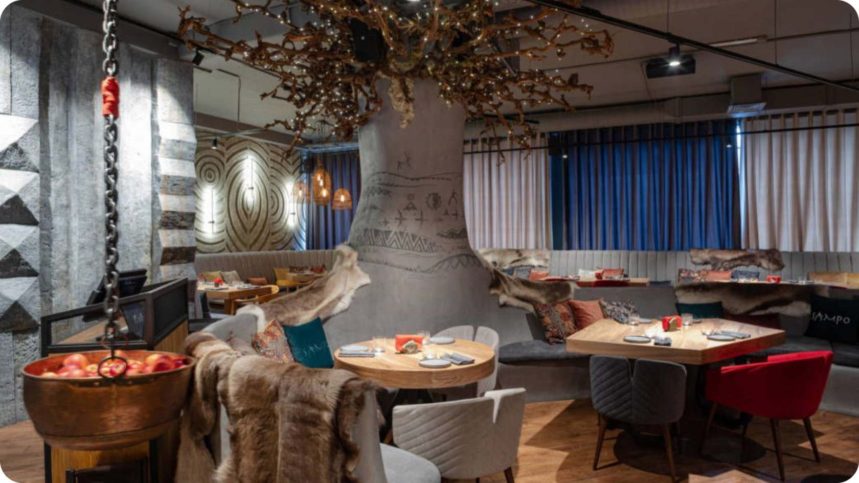 Необычную кухню и впечатляющую барную карту дополняет интерьер: стилизованные под скалы стены и колонны, украшенные оленьими шкурами диваны, светильники в форме огромных рыб, огромный камин в центре зала и множество других тщательно проработанных деталей — например, гардеробных номерков в виде блесен.