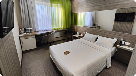 Номерной фонд отеля включает 216 удобных комнат — идеально для группового заселения сотрудников. Комнаты оформлены в спокойных тонах, есть кондиционер, телевизор, сейф, телефон и стабильный Wi-Fi. Гости отмечают тишину, чистоту и комфорт.